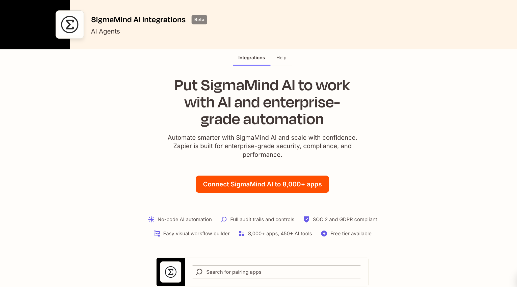 Connect SigmaMind AI Voice and Chat agents to thousands of apps via Zapier. Automate CRM updates, support workflows, follow-ups, and more without coding.